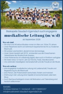 Du bist hier: Startseite1 / Beispiel-Seite2 / Die Musikkapelle Staudach-Egerndach sucht eine musikalische Leitung (m/w/d)3 / Dirigentensuche Anzeige-7