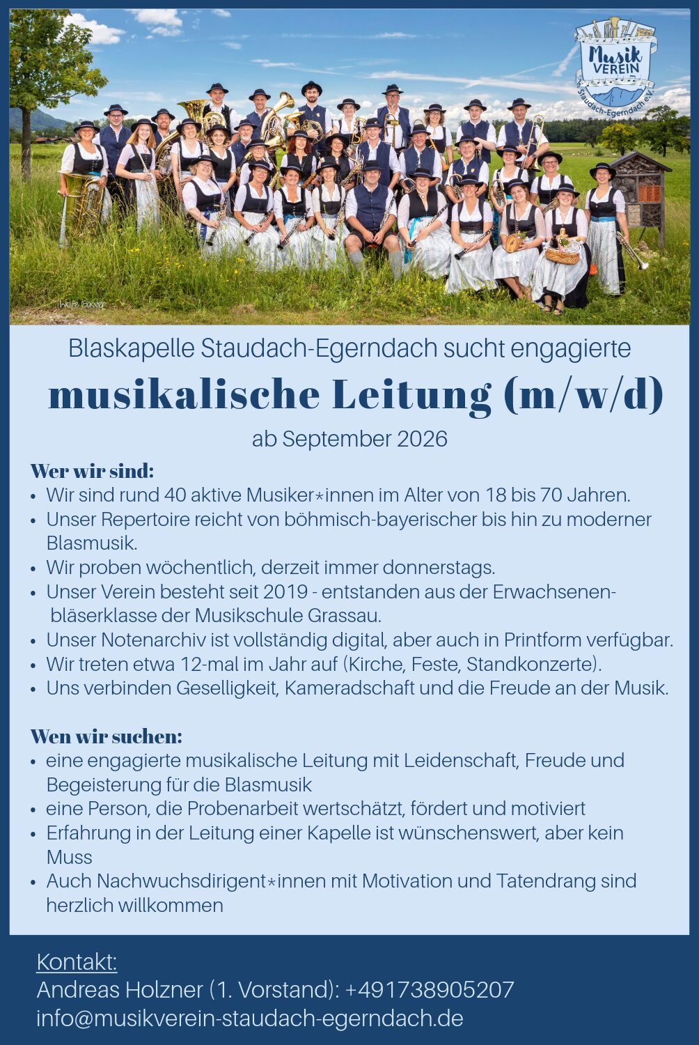 Du bist hier: Startseite1 / Beispiel-Seite2 / Die Musikkapelle Staudach-Egerndach sucht eine musikalische Leitung (m/w/d)3 / Dirigentensuche Anzeige-7